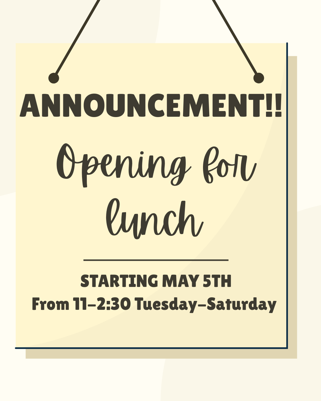 We are SO excited to announce that we are opening for lunch very soon! New hours starting May 5th: Lunch 11am-2:30pm & Dinner 4pm-830pm. Stay tuned for the launch of our lunch menu!