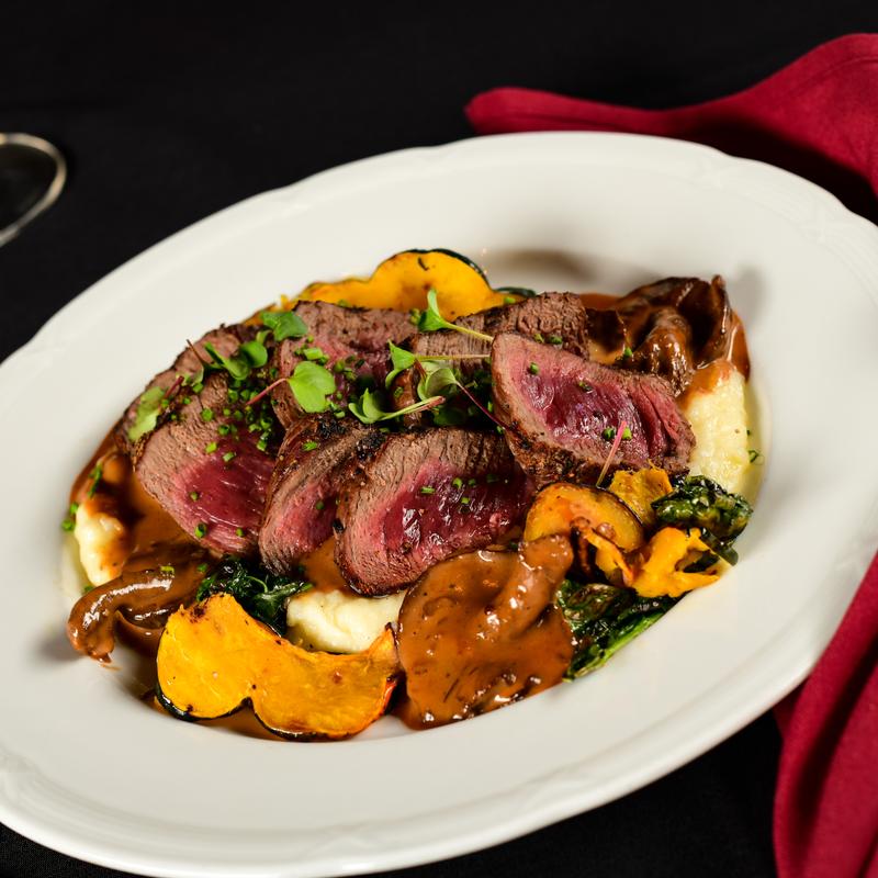 Mashed potatoes, local harvest mushroom, sauteed kale & acorn squash with a diane sauce